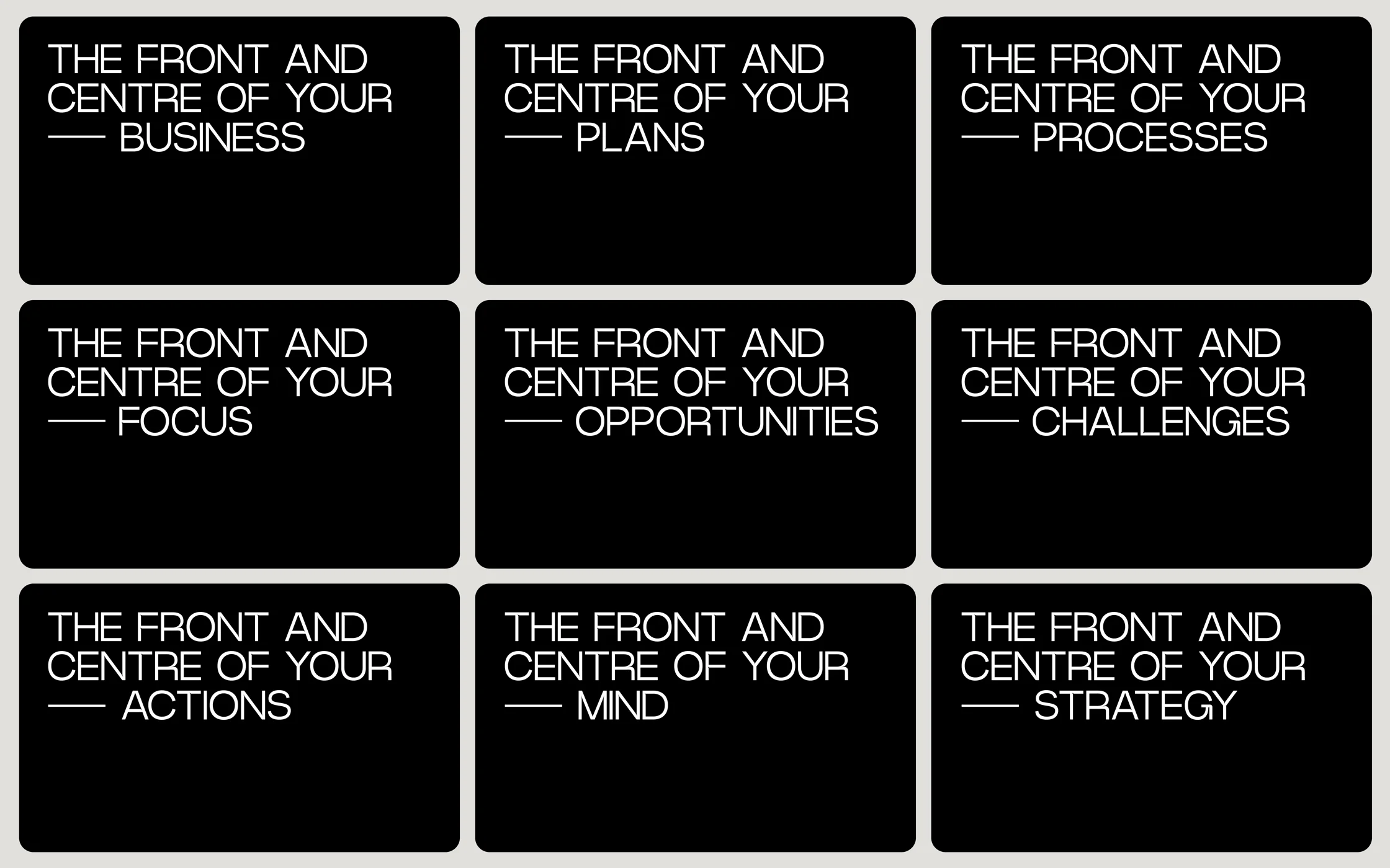 After many hours and hundreds of ideas, we struck upon Front&Centre, a single idea that captured what David and his company do. This idea expanded into an entire ‘unified language world’ and lit up the eyes of our client. From naming David ‘the front man’ to creating diagnostics called ‘Spotlight’ the brand world had begun.